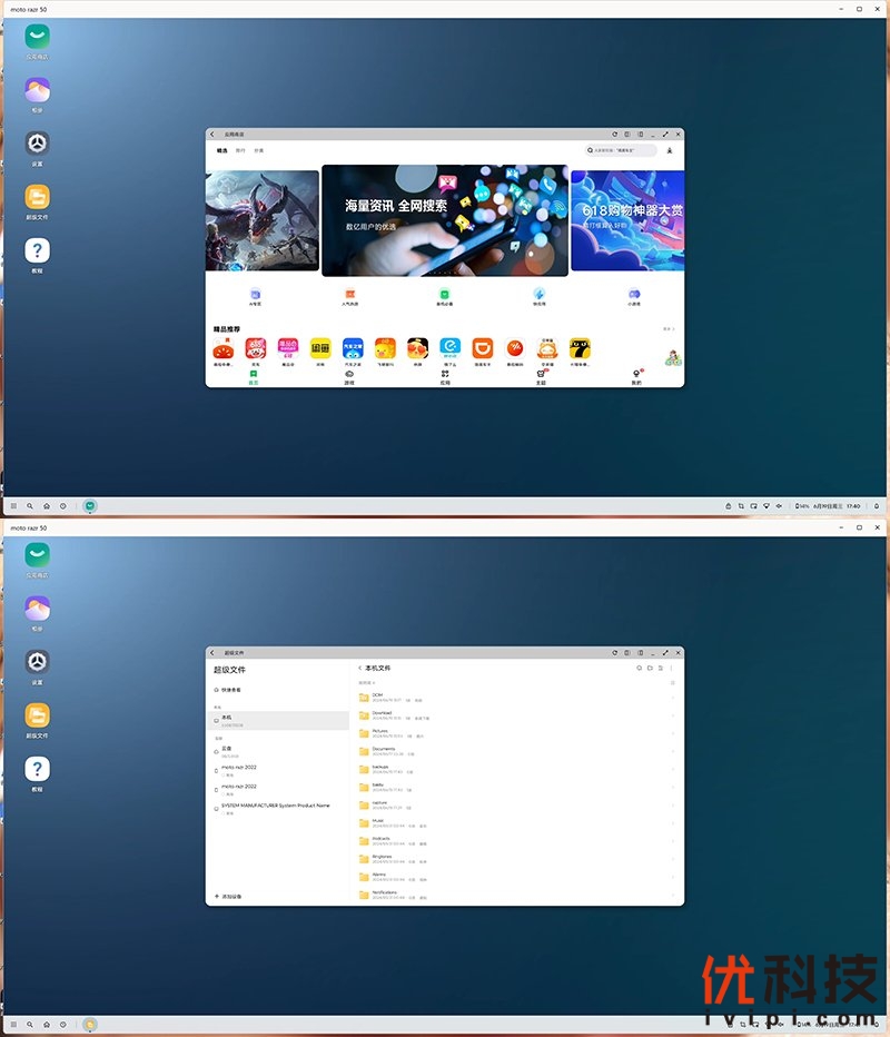 其中电脑模式还是很有趣的,开启后moto razr 50将化身为一台电脑主机,通过PC端的显示器来进行应用,默认桌面也是非常容易上手,并且可以实时访问机身内的文件以及各类程序。