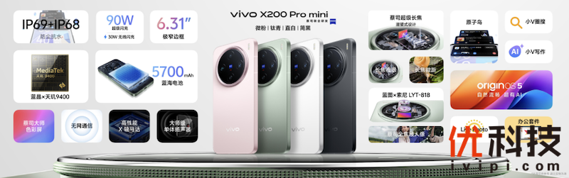 vivo X200 Pro mini则采用了高颜值直屏设计,6.31英寸小直屏拥有极窄四等边,8.15mm超薄机身仅重187g,带来舒适的握持,揣入上衣口袋即可轻松出发。vivo X200 Pro mini共发布了钛青、微粉、直白、简黑四款多彩配色。其中,钛青采撷自大自然治愈柔和的青绿色,微粉则是落樱缤纷色彩与金属质感的浪漫结合,搭配磨砂质感的AG玻璃,两款配色尽情散发着时尚多彩的青春气息。vivo X200 Pro mini同样搭载蔡司超级长焦,采用潜望设计并支持长焦微距,同时拥有vivo与索尼联合定义的主摄图像传感器蓝图x索尼LYT-818,影像实力“超级”在线。除此之外,蓝晶x天玑9400、公里级无网通信、蔡司大师色彩屏、全亮度高频PWM调光、OriginOS 5 AI新体验、5700mAh大电池等面面俱到,合力打造“一超多能”年度口袋旗舰。