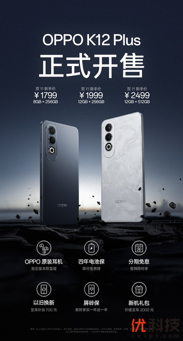 10 月 15 日上午 10 点,「续航千里马,游戏小钢炮」 OPPO K12 Plus 正式开售,首销到手价 1799 元起。首销购机用户在OPPO官方商城、京东、天猫、拼多多官方旗舰店以及线下零售门店购买 OPPO K12 Plus 可免费享赠有线耳机、四年电池保、3期免息等多种福利。OPPO K12 Plus 拥有「雪峰白」与「玄武黑」两款配色, 8+256GB 版本双 11 到手价 1799 元,12+256GB 版本双 11 到手价 1999 元,12+512GB 版本双 11 到手价 2499 元。