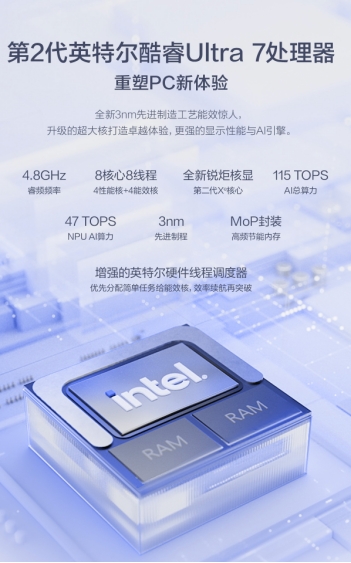 华硕无畏Pro14 2024搭载的第二代英特尔酷睿Ultra7处理器,在性能、AI、续航上实现了巨大飞跃,被称为有史以来最高效的x86处理器。它采用了3nm先进制造工艺,具备8核心8线程,最高睿频达4.8GHz;内置全新Xe2架构驱动的英特尔锐炫核显,游戏、创作实力飙升;采用增强版NPU 4.0 AI 引擎,NPU AI算力提升至47 TOPS,相较上一代提升4倍。总AI算力高达115 TOPS,AI性能平均提升约58%,实现AI高清图片快速直出,本地AI运行更安全流畅,加速AI创作。该处理器还首次采用了MoP封装设计,将32GB 8533MHz LPDDR5X内存与CPU整合到单一封装内,带来更低的延迟、更好的功耗表现,以及更小的核心和内存占用面积。