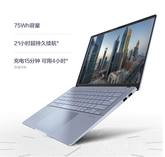 不止AI算力领先行业,第二代酷睿Ultra在续航方面的提升更是革命性的。模块化的设计加上全新的架构体系,使它实现高达50%功耗降低,2倍能效提升,在保证性能效率的同时性能大幅延长续航。全新华硕无畏Pro14 2024搭载75Wh长寿快充电池,使用寿命提升20%,在酷睿Ultra处理器的加持下,续航至高可达约21小时,满足全天候用机需求。同时支持华硕闪充技术,充电15分钟可用4小时。