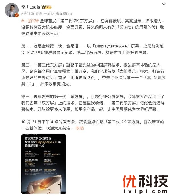 - 7.一加携手京东方推出第二代东方屏,全球首块获 DisplayMate A++ 认证好屏
