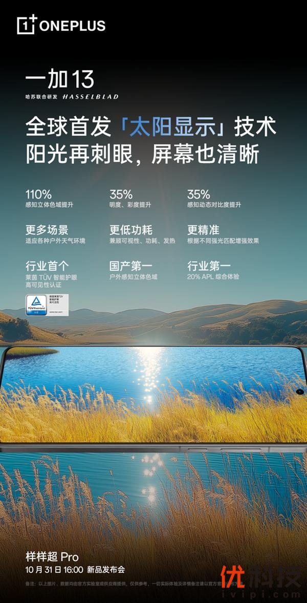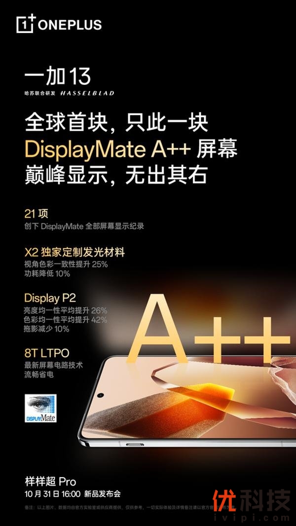 基于在屏幕素质、高亮可见、护眼能力以及流畅体验四个维度带来的巅峰体验,第二代东方屏将彻底打破行业标准天花板。除了这块全球顶级的满分好屏外,一加 13 作为一加品牌新十年年度旗舰之作带来产品力的全方位升级,旗舰体验样样超 Pro,外观及材质采用全新「破晓」设计语言,呈现超 Pro 的美学质感;同时,在骁龙 8 至尊版移动平台基础上,提供同档唯一 24GB+1TB 超级存储,释放超 Pro 的满血性能;此外,搭载哈苏影像大师及同档唯一潜望长焦,带来超 Pro 的旗舰影像体验。一加 13 将于 10 月 31 日正式发布,更多新品信息敬请期待。