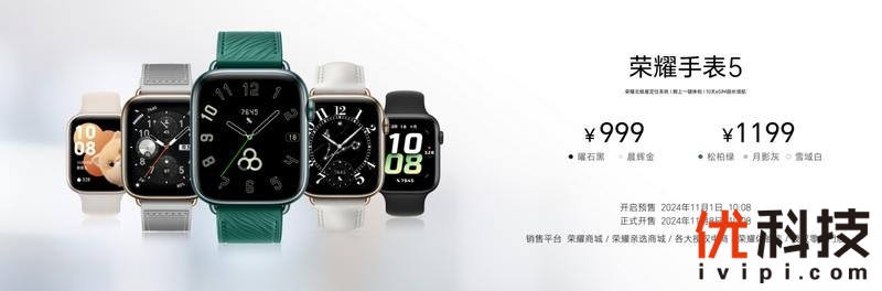 荣耀手表5将于11月1日开启预售,11月8日正式开售,起售价999元,提供曜石黑、晨辉金、松柏绿、月影灰和雪域白五款配色,以及超过5000种丰富表盘可选,满足用户不同需求。