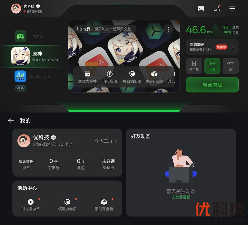 系统内置了游戏空间,在游戏空间内可以选择启动游戏的运行模式,同时还显示电池电量以及剩余续航时长和当下网络延时,并且在游戏中心内的活动中心还有着多种互动活动。