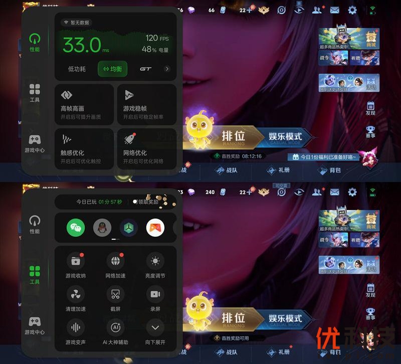 首先是游戏助手方面,默认游戏页面左上角向内滑即可呼出游戏助手,默认面板显示当下网络延迟和屏幕刷新率,并且支持手机性能模式的切换,用户可根据游戏的要求切换,另外游戏助手内还汇聚了多项实用辅助功能,例如游戏收纳,网络加速等等。