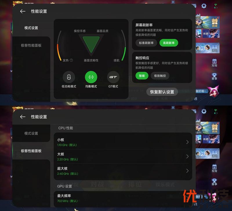 同时在游戏助手内依旧集成了极客性能面板,在面板内可以手动调节CPU以及GPU的主频幅度,便于用户细微调整手机的性能表现。