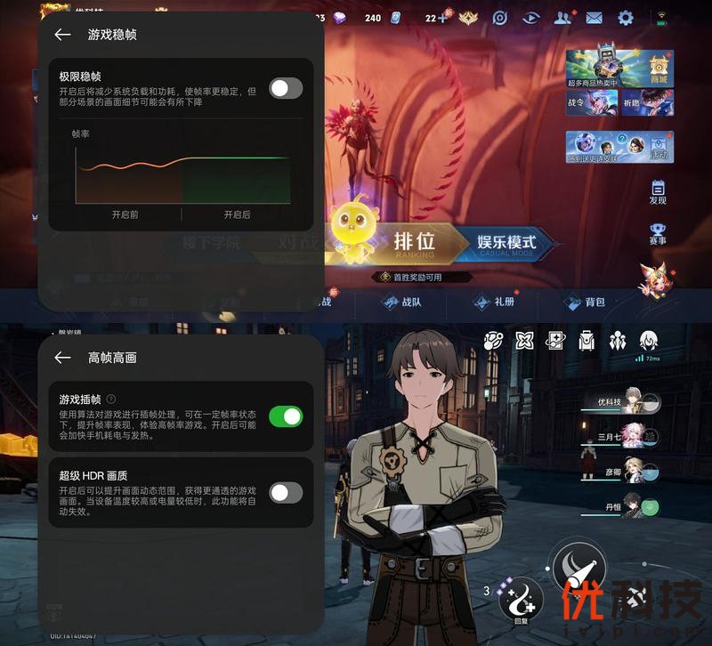 在游戏助手内可以开启超级HDR画质以及游戏稳帧功能,开启后可提升游戏画面动态范围,配合着所搭载的S2柔性电竞直屏,显示效果还是非常的震撼,另外还支持星铁等游戏的芯片级超帧功能,还对性能调度和资源分配进行优化,转场/加载速度提升11%,低负载功耗降低3%。