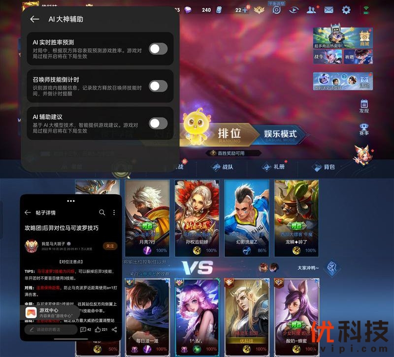 另外系统内还搭载了AI大神辅助2.0功能,该功能为王者玩家提AI胜率预测、对线技巧、策略引导三项核心功能,不仅可以智能提供阵容和出装建议,同时还能在对局中进行关键的信息提醒,增强玩家的游戏意识。