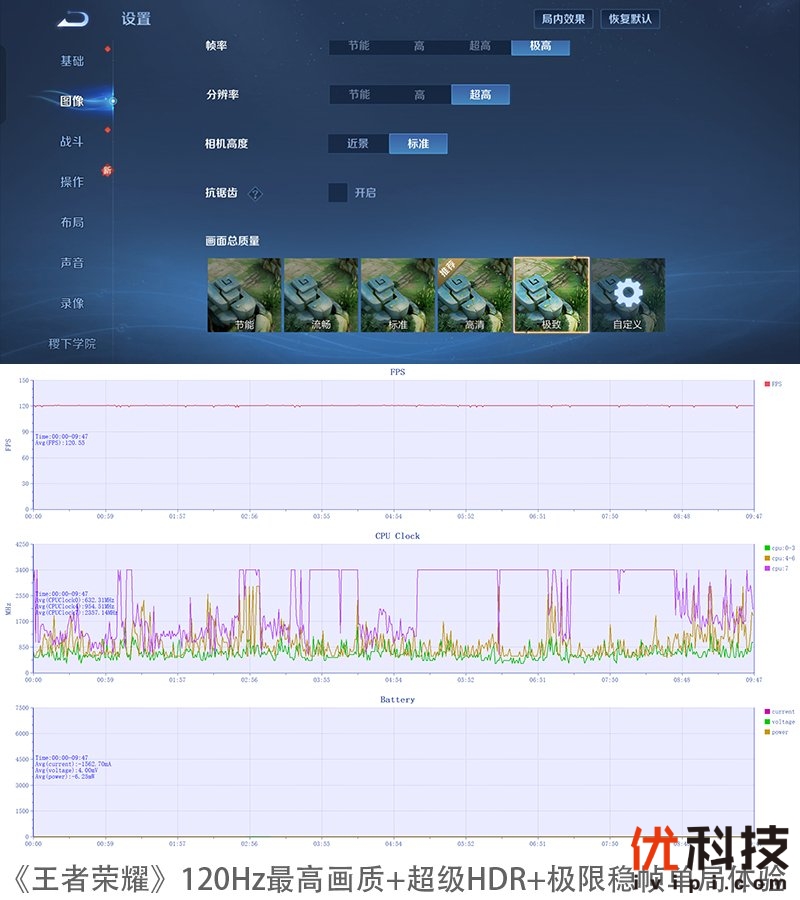 首先在王者荣耀的体验上,画质模式选择120Hz的各项最高画质,并且开启游戏助手内的超级HDR画质和极限稳帧功能进行单局排位赛体验,从帧率图上可以看到将近10分钟的单局排位赛平均帧率高达120.55Hz,整体趋于一条直线,即便是游戏中角色重生的大场景切换也没有造成较大的波动。