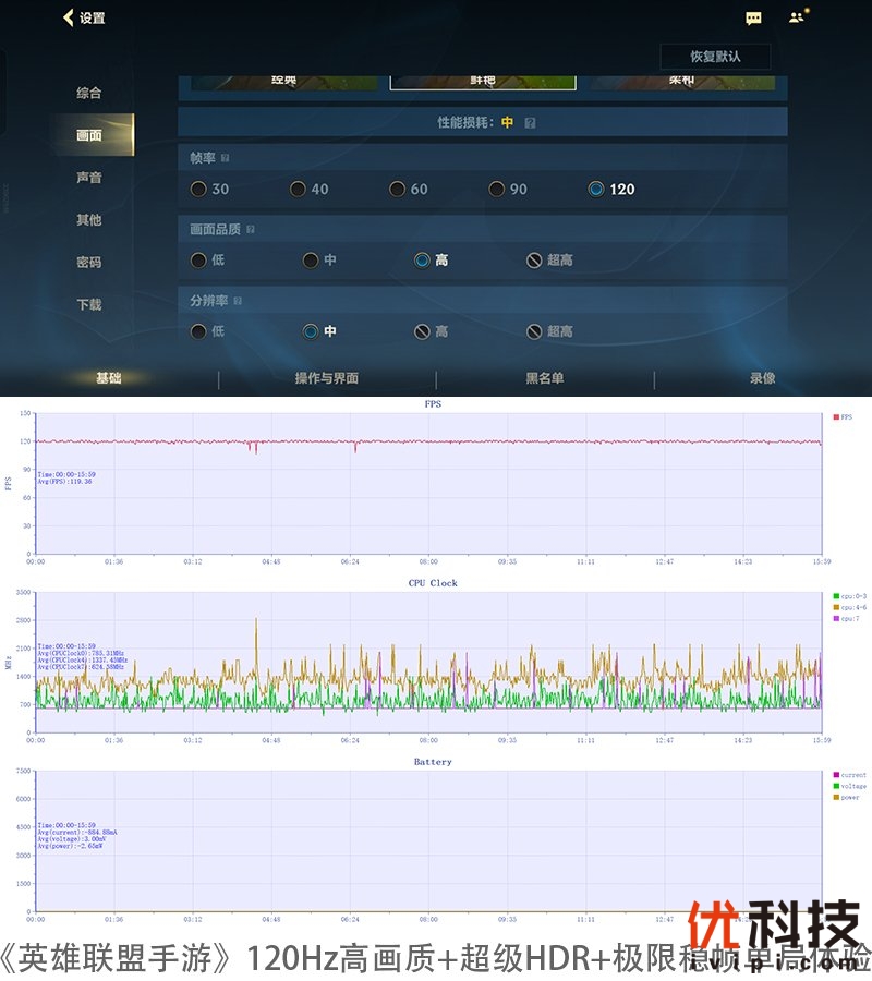 而耗时更长的英雄联盟手游在开启120Hz高画质模式下,同步开启超级HDR画质以及极限稳帧功能,单局近16分钟的排位赛表现也是较为出色,平均帧率高达119.36Hz,帧率波动非常低,即便是在大型团战下也没有出现卡顿。
