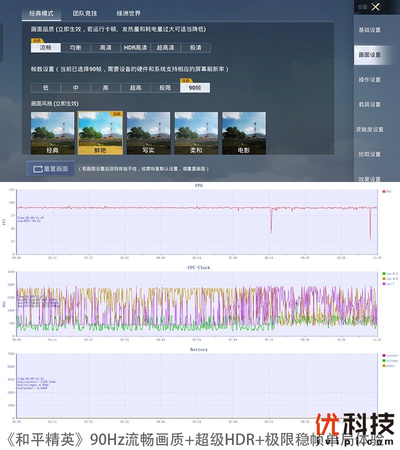 至于场景较大的对战类游戏和平精英在画质方面选择90Hz流畅画质+超级HDR画质+极限稳帧功能,平均帧率为89.61Hz,游戏过程丝滑流畅,并没有出现卡顿的状况。