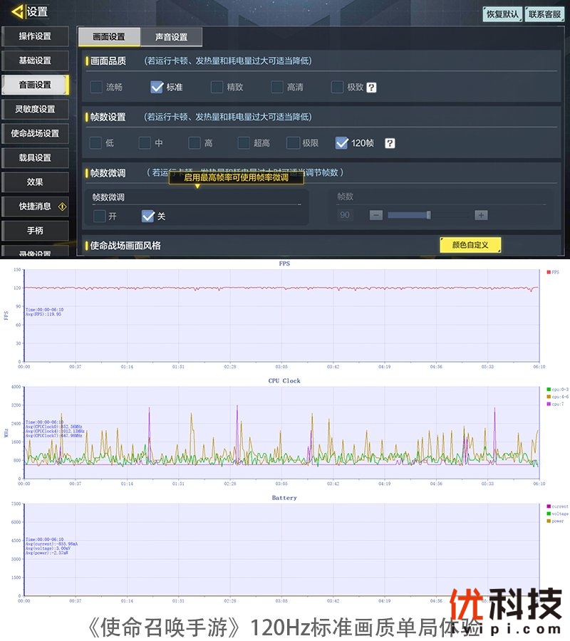 而与和平精英类似的大场景对战类游戏使命召唤手游则是选择120Hz标准画质,经过短时间的单局比赛,平均帧率为119.95Hz,基本上都是贴着满帧在运行。