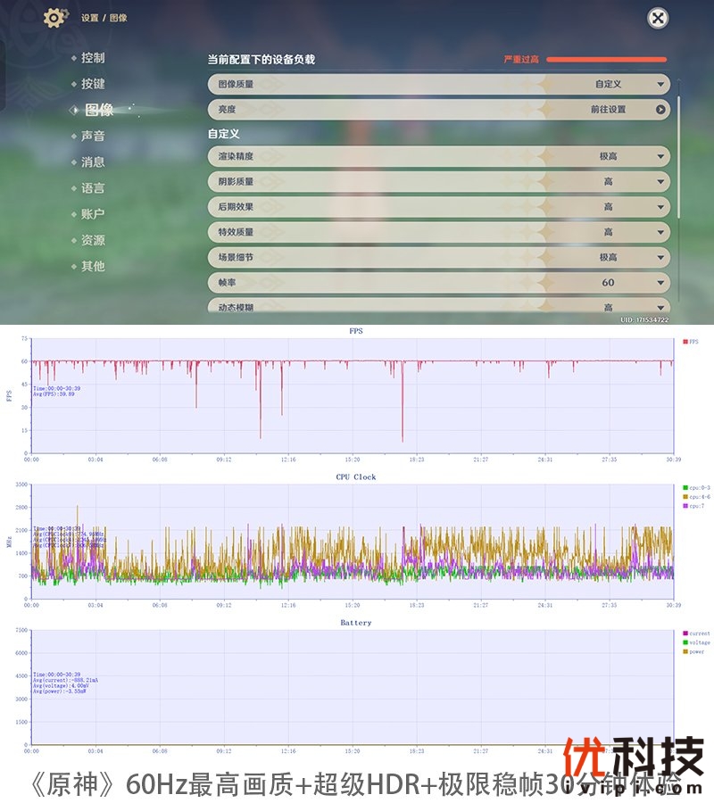 原神的体验中,选择了60Hz的各项最高选项画质,并且开启超级HDR画质以及极限稳帧功能,进行了半小时的模拟日常游戏体验,其中包含副本对战以及任务跑图对战等等,整体运行流畅丝滑,场景加载迅速自然,半小时的游戏体验平均帧率高达59.89Hz,出现的帧率波动也仅是在地图传送时出现。