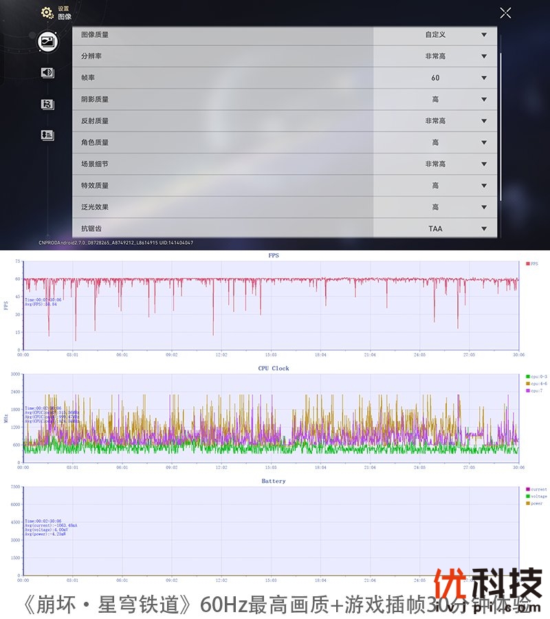 星铁也是同样开启60帧各项最高画质模式下进行模拟日常游戏体验,并非单纯的跑图,助手功能方面开启了游戏插帧功能,不同于原神的大场景环境,星铁需要在多个场景切换进行游戏对战,切换过程中帧率必不可免地降低,在30分钟的游戏中依旧保持了58.84Hz的平均帧率,但由于Neo7采用了芯片级超帧,实际游戏的流畅度体验更好。