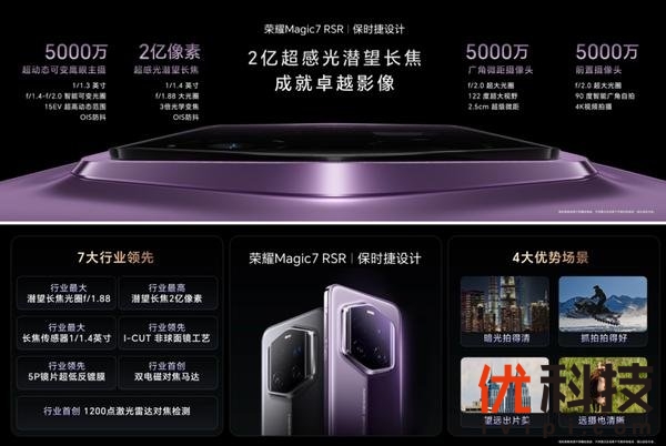 在本次发布会上,荣耀Magic7 RSR保时捷设计,更是以超豪华的影像配置,配合全新大王影像升级,展示了全面、强大的拍照实力。荣耀Magic7 RSR保时捷设计,拥有行业领先2亿像素超感光潜望长焦,搭载行业更大底的1/1.4英寸长焦传感器,以及行业更大潜望长焦光圈f/1.88,让进光量提升98%,实现了业界长焦镜头的更强感光能力;搭配领先I-CUT非球面玻璃镜片加工工艺和行业领先的5P镜片超低反镀膜,大幅提升暗光拍摄效果,引领业界暗光长焦极限解析力和综合效果的突破,让长焦暗光拍摄画质更佳,长焦大光圈虚化更有质感,长焦微距更清晰更好用。