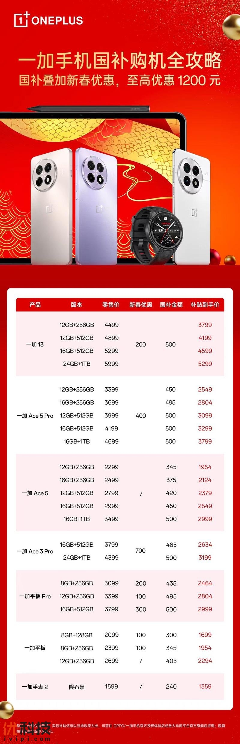 1月20日,一加 Ace 5 Pro 开启新春优惠活动,全版本限时优惠 400 元,到手价仅需 2999 元起,此前已购机用户全部可享受官方价保。同时,一加手机全系产品即日起均可享受零售价 15% 的国家补贴,至高可享 500 元。