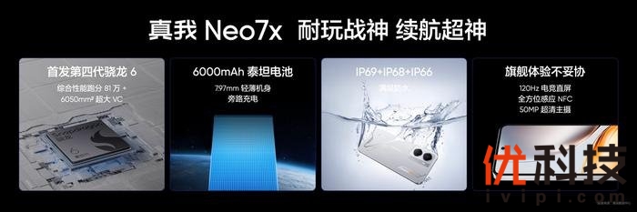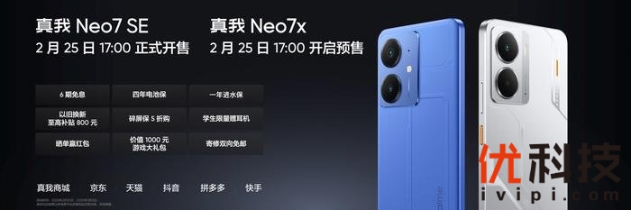 •Neo系列千元战略新品——真我Neo7x。首发第四代骁龙6,同时配备6000mAh泰坦电池和IP69满级防水。真我Neo7x将于2月25日17:00全渠道开启预售,首销价1299元起,国补到手价仅1105元起;