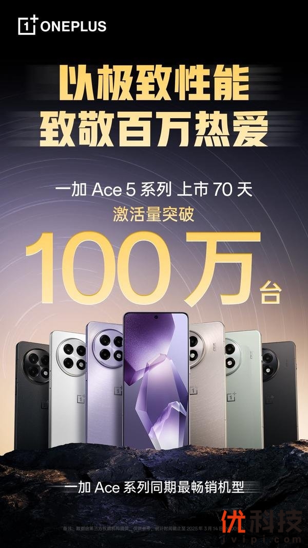 3 月 17 日,一加官方宣布,一加 Ace 5 系列上市 70 天累计激活量突破 100 万台,成为一加 Ace 系列同期最畅销机型。