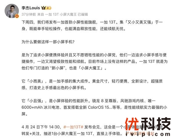 一加 13T将于4月24日正式发布,开启小屏体验新时代