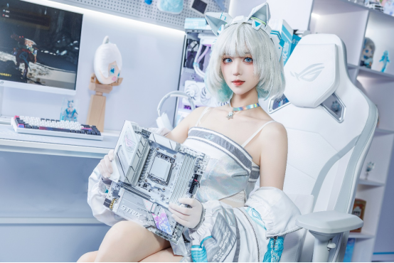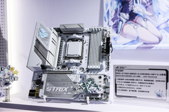 到了雪武战姬痛屋,除了刚发布的ROG B850小吹雪主板外,还展示了一系列Intel 800系和AMD 800系吹雪家族主板和两台高能吹雪全家桶。其中一台以华硕ROG X870吹雪为核心打造,16+2+2供电模组和混合双模超频,软硬结合,让锐龙处理器如虎添翼。还有丰富的疾速互联和拓展性,4个M.2、双USB 4、WiFi 7等统统都有,满足玩家的需求。另一套则是以华硕ROG B860小吹雪主板为核心打造的白色小主机。沿袭吹雪家族标志性银白装甲,并在芯片组和大面积的M.2散热片上融入雪武战姬靓丽身影,还有支持神光同步的ROG LOGO,颜值超高。而14+1+2+1供电模组(80A)搭配NPU Boost加速引擎和异步时钟,轻松驾驭酷睿200S处理器。是玩家白色主题电竞装备的必备装备。
