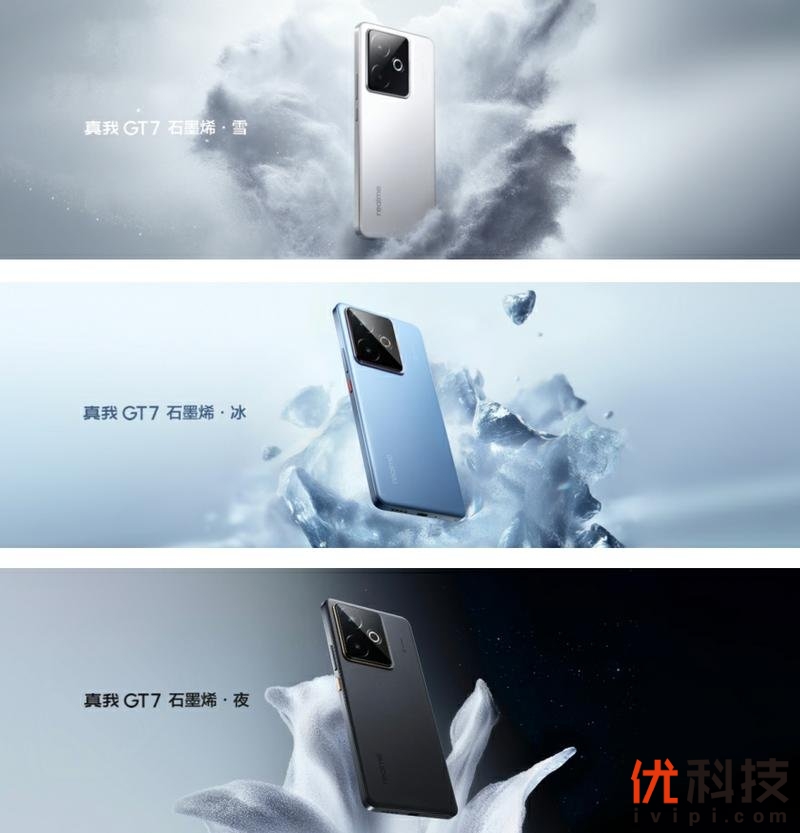真我GT7坚持简约、质感、科技力的设计理念,打造三款独特配色,其中「石墨烯 · 雪」致敬GT大师探索版经典的雪山配色,并且通过独家的冰感磨砂工艺,实现光线照耀下晶光闪闪的效果,还原雪花冰晶折射之美,触感更是如初雪般冰凉温润;另外两款配色「石墨烯 · 冰」和「石墨烯 · 夜」还采用了灵感碰撞设计,在Deco与电源键增添撞色设计元素,为简约机身增添一丝灵动。