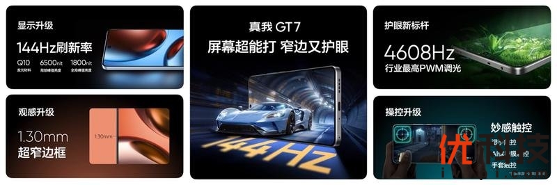 出色的游戏体验需要一块出色的电竞屏。真我GT7首发144Hz超窄边护眼直屏,其采用京东方Q10发光材料,亮度更高的同时降低功耗,实现行业最强6500nit局部峰值亮度以及1800nit的全局峰值亮度,配合1.30mm超窄边框,屏幕观感更出色。