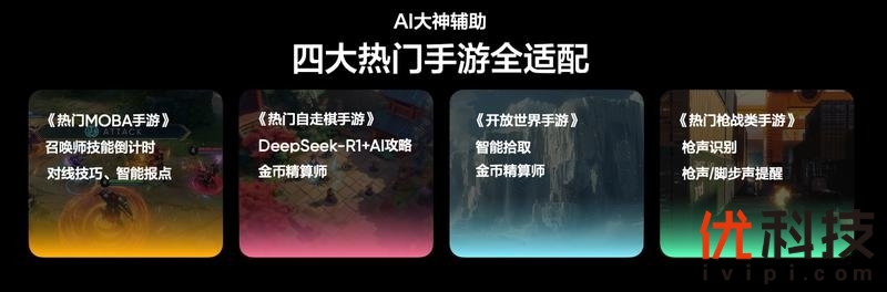 真我GT7全新升级的AI大神辅助,除支持《王者荣耀》《金铲铲之战》《原神》等主流手游外,还支持《和平精英》枪声识别功能,助力玩家轻松"吃鸡"。超神一键连招、游戏4D振感、游戏专属内存Pro等功能,同样一应俱全。