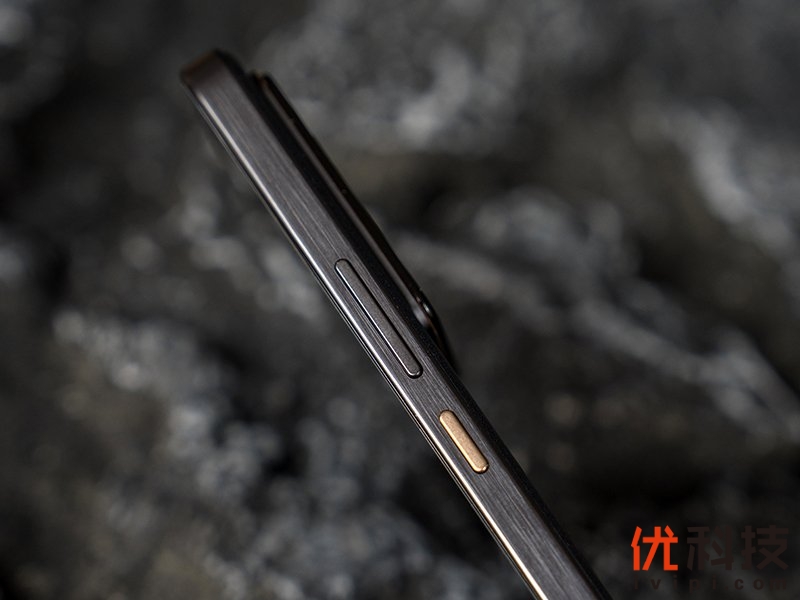 机身右侧自上至下分别为一体式音量控制键和撞色电源键,按键手感还是相当不错的,清脆并且回弹有力,同时还没有旷量。