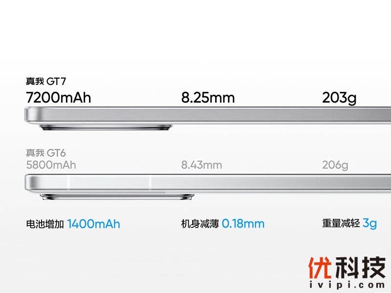 损耗更小。同时得益于新一代硅碳材料更高的含硅量(10%),电池能量密度达到了841Wh/L,配合极片重塑工艺、高性能电解液以及电路板折叠技术,让大电池机身也能更加的轻薄,这也让真我 GT7薄至8.25mm,轻至203g,比上代减薄0.18mm,减重3g,完美地诠释了,既有实力又有身材。