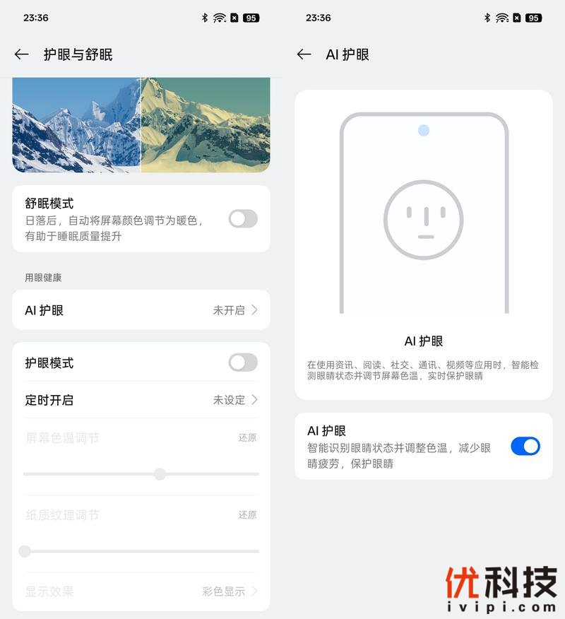 在护眼方面GT7也是有着不错的实力,支持舒眠模式,有助于提升睡眠质量,另外护眼模式支持自定义设定,细节方面全交由用户选择。而AI护眼功能也是非常全面,在使用资讯或者阅读等用眼应用时,系统将智能检测眼睛状态并调节屏幕色温以达到护眼的目的。