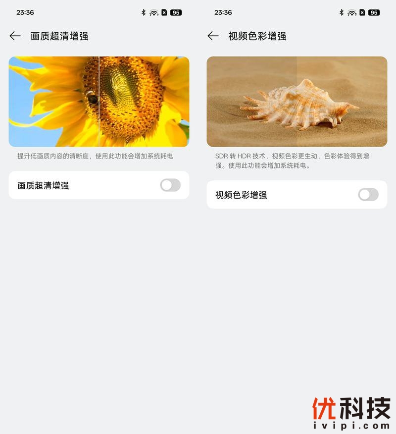 在画质优化方面则是可以开启画质超清增强功能,开启后将会提升低画质内容的清晰度。而视频色彩增强功能则是SDR转HDR,让色彩更加生动。虽然功耗方面有所增加,但得益于超大电池的加持,所以在观影的时候还是开启会更好一些。