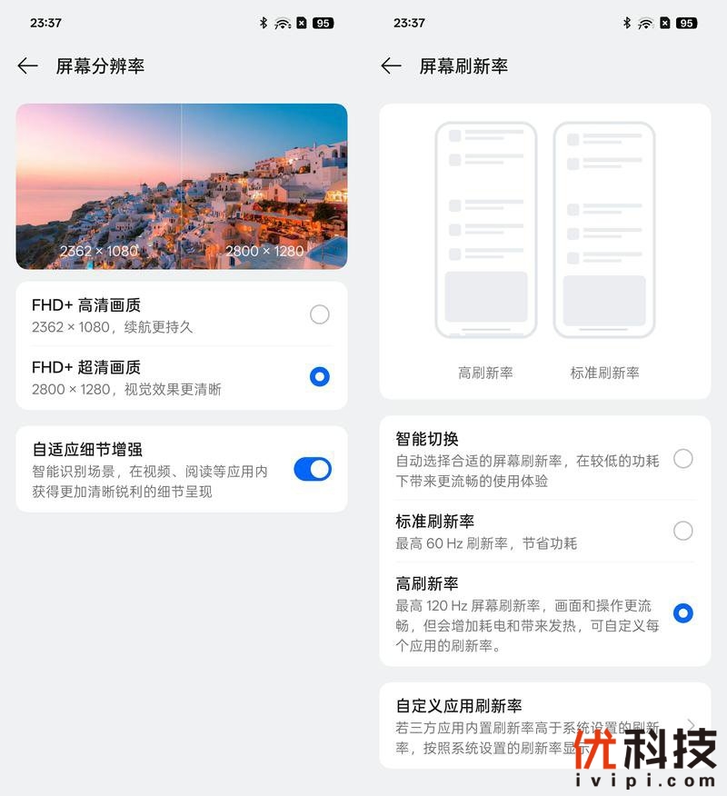 至于屏幕分辨率方面则是支持两档可选,同时还支持自适应细节增强功能,系统能够智能识别场景,在视频、阅读等应用内获得更加清晰锐利的细节表现。而刷新率方面则是支持三档可选,选择默认的智能切换即可,若有较高的刷新率要求也可以选择高刷新率模式,开启全局120Hz高刷,并且在此档内还支持自定义应用的刷新率功能,最高可选144Hz高刷,细节设定非常的友好。