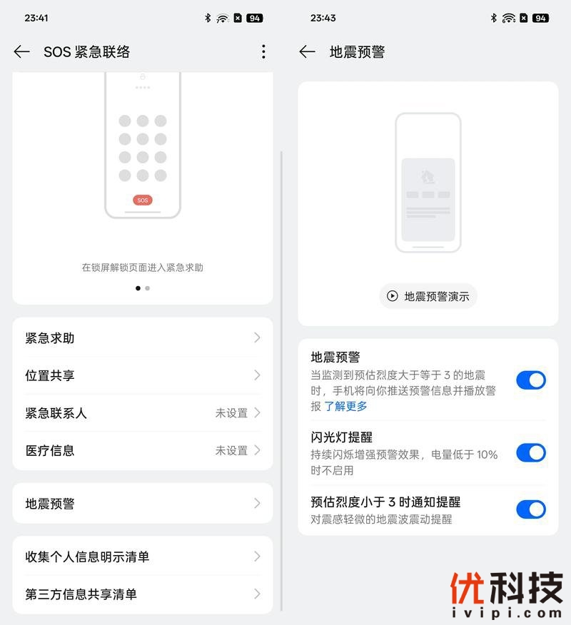 在系统内可以设定相关SOS紧急联络功能,用户连按5次电源键即可快速进入紧急求助页面,开启后将便于在紧急时刻脱险,而地震预警功能也是非常有用,建议开启。