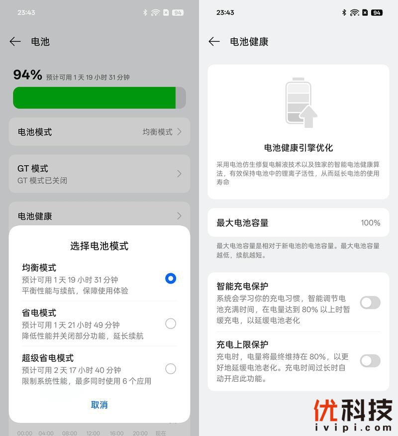 系统内置的电池功能中可以选择三种电池运行模式,并且还有着可使用时长提示,这点也是非常方便,同时可以开启GT模式以提升手机性能。另外系统内还集成了电池健康功能,可以实时了解手机的电池健康程度,并且支持智能充电保护以及充电上线保护功能,这点对于电池的健康运行也是有着很好的助力。