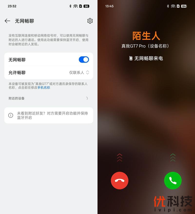 系统内还搭载了无网畅聊功能,在没有网络和移动信号时,可以使用无网畅聊功能和附近的人进行通话,支持免提和听筒,和普通来电页面相仿,实测通话语音效果还是不错的。
