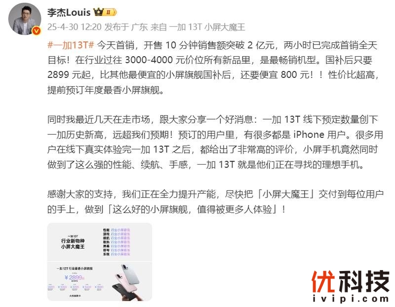 4 月 30 日 上午 10:00,「小屏大魔王」一加 13T 正式开启首销,开售 10 分钟销售额便突破 2 亿元大关。作为行业“新物种”,一加 13T 在 6.32 英寸的轻薄机身下,带来质感、性能、散热及续航等方面的全面进化,刷新小屏体验上限,一经发布便广受媒体与用户的广泛认可。一加中国区总裁李杰表示:“一加 13T 两小时已完成首销全天目标,在行业过往 3000-4000 元价位所有新品里,是最畅销机型。国补后只要 2899 元起,比其他最便宜的小屏旗舰国补后,还要便宜 800 元。同时,一加 13T线下预定数量创下一加历史新高,远超我们预期。预订的用户里,有很多都是 iPhone 用户,很多用户在线下真实体验完一加 13T 之后,都给出了非常高的评价。”