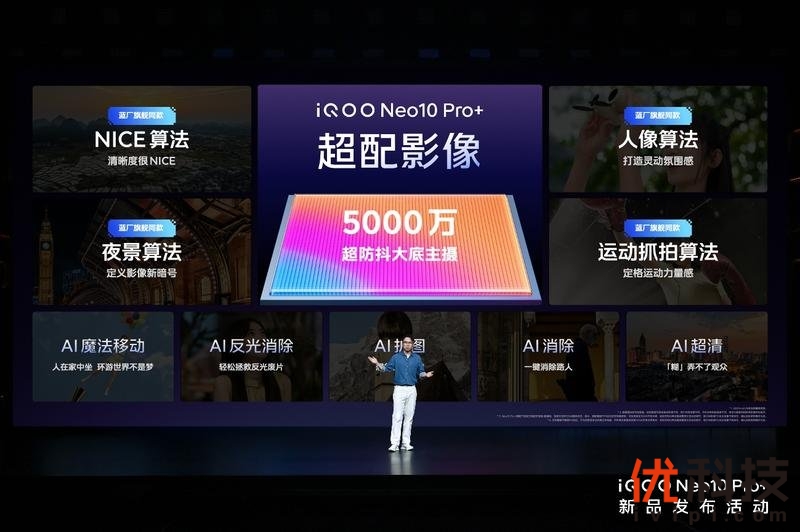 影像方面,Neo10 Pro+ 具备 5000 万像素超防抖 1/1.55" 大底主摄,搭配独家定制的OIS超级光学防抖和新一代 VCS 人眼仿生技术,并拥有蓝厂旗舰同款的夜景、人像和运动抓拍等 NICE 算法加持,让你随手就能拍出质感大片,还有 AI 修图大师为你拯救废片,玩出创意好片。Neo10 Pro+ 亦有当下热门的动态照片,同样支持 NICE 算法,还支持动态水印,并能轻松分享到微信朋友圈、小红书、微博和抖音,让照片更时髦。