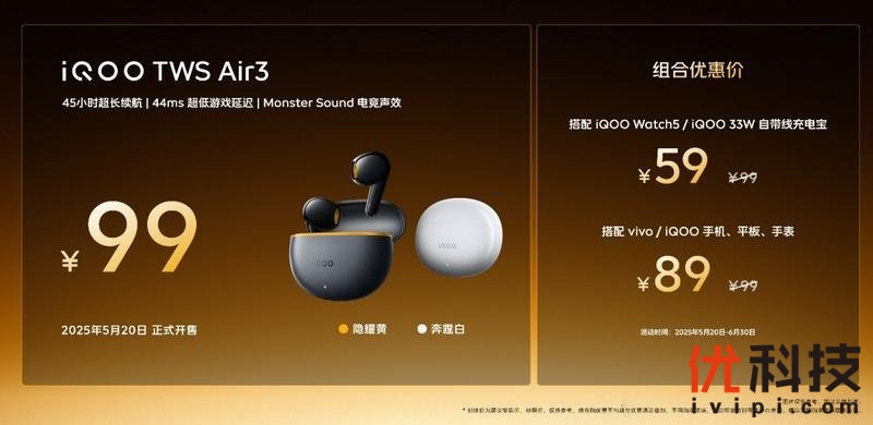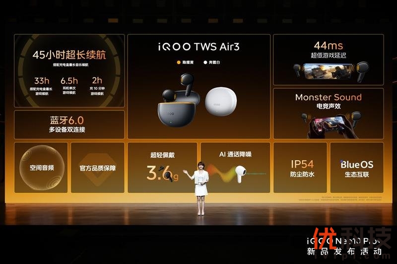 iQOO TWS Air3 具有“隐耀黄”和“奔霆白”两款配色,3.6g 单耳机佩戴轻盈舒适,支持 IP54更能安心使用;支持 LC3 音频编码,可实现全链路游戏 44ms 和耳机端 15ms 的低延迟;耳机单次听歌可达 10 小时,单次游戏可玩 6.5 小时,配合耳机盒可长达 45 小时听歌续航,而充电 10 分钟,就可连手机畅玩游戏2 小时,真正做到充得快、玩得久;拥有 12mm 高解析复合声音单元,具备空间音频、Monster Sound 电竞声效和 DeepX 3.0 立体声效,无论听歌还是玩游戏,都能带来更好聆听声效;支持蓝牙 6.0 多设备双连接和无线 K 歌耳返,并融入 BlueOS 生态,与生态内设备实现智联互通,是 vivo / iQOO 手机的极佳拍档。