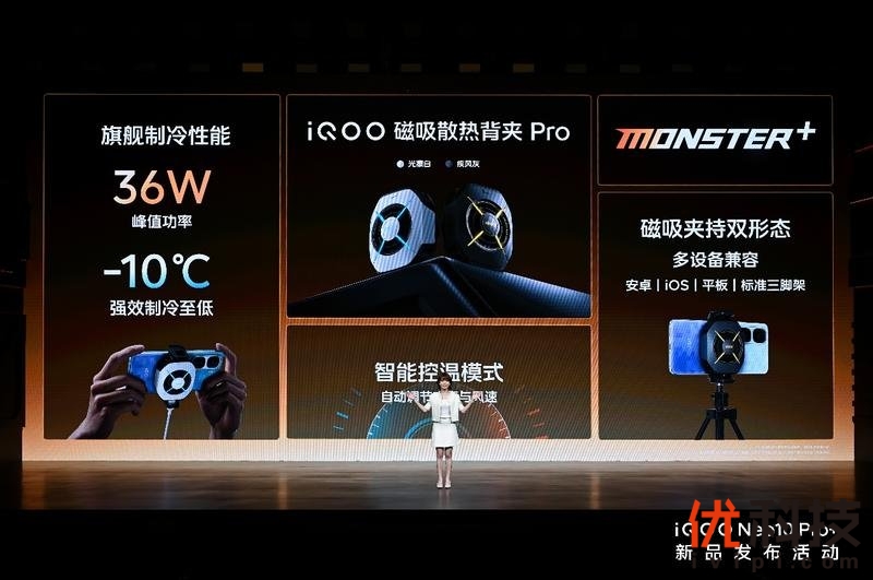 iQOO 磁吸散热背夹 Pro 具有“疾风灰”和“光凛白”两款配色,配备炫酷的炫彩 Halo 灯效,支持磁吸 / 夹持双形态,可兼容多品类设备和标准三脚架,适用更多场景,直播更方便;可实现至高 36W、稳态 30W的超大功率旗舰级散热,可极速降温低至 -10℃,仅需 26 秒骤降至 0℃,更可激活 iQOO 手机和平板的 Monster+ 模式,进一步释放出众性能,高功耗游戏也能长时间稳帧运行;采用智能变频设计,维持手机合适温度的同时,既省功耗又能保持流畅游戏,并避免手机内部产生冷凝水。