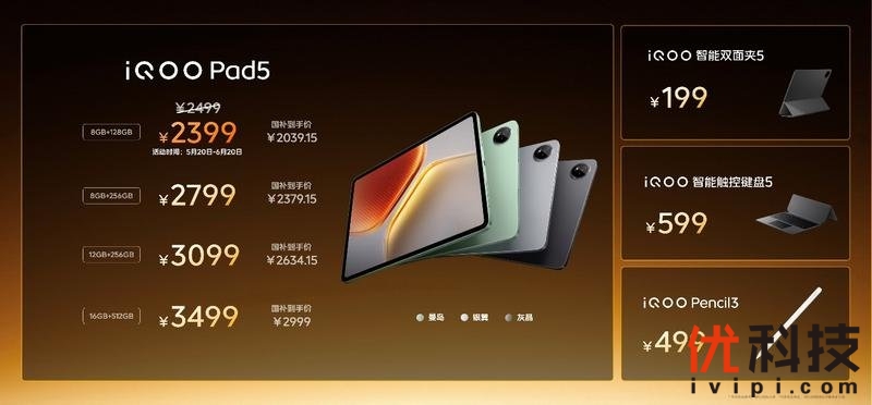 iQOO Pad5 系列共有“曼岛”、“灰晶”和“银翼”三种配色可选,iQOO Pad5 Pro 提供 8GB+256GB、12GB+256GB、12GB+512GB 和 16GB+512GB 四种存储组合可选,到手价 3199 元起,iQOO Pad5 提供 8GB+128GB、8GB+256GB、12GB+256GB 和 16GB+512GB 四种存储组合可选,到手价 2399 元起;iQOO WATCH 5 到手价 799 元起;iQOO 磁吸散热背夹 Pro、iQOO TWS Air3和 iQOO 33W 自带线充电宝到手价分别是 199 元起、99 元起和 129 元起。各款 IoT 设备搭配 iQOO Neo10 Pro+ 组合购买还能享受更多优惠。