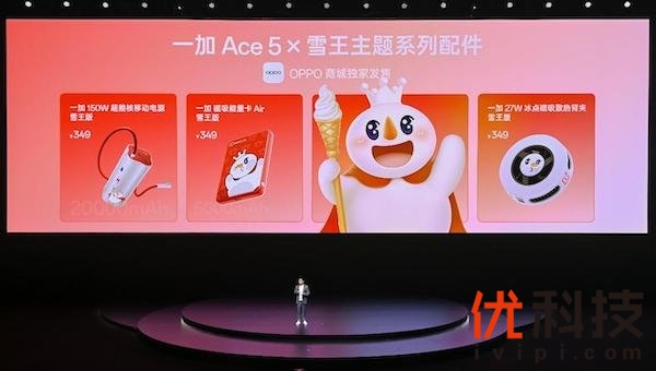 一加 Ace 5 至尊系列还联合蜜雪冰城推出了雪王主题系列配件,包括150W超能核动电源雪王版、磁吸能量卡Air雪王版、27W冰点磁吸散热背夹雪王版等产品,售价均为349元,将在OPPO商城独家发售。