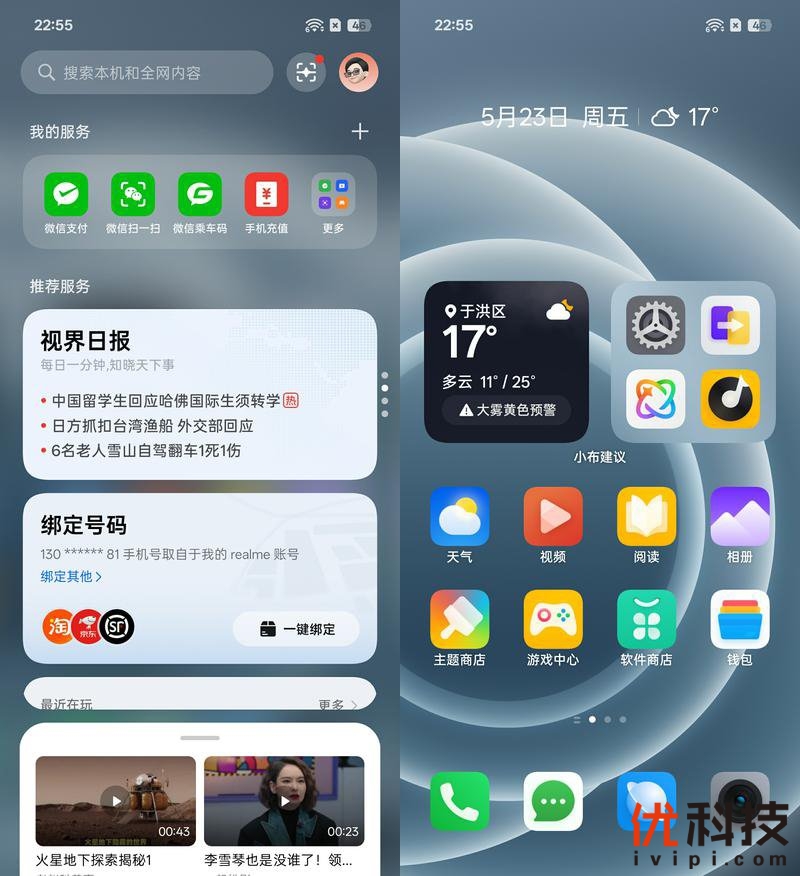 系统支持多种主题选择,并且桌面模式用户也可以自定义,在首页上搭载了小布建议,让AI更加轻松地融入生活,同时还集成了多任务功能,切换应用更加的方便。而在负一屏上依旧集成了多项快捷功能以及非常实用的小程序。