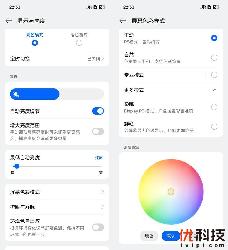 显示功能也是非常的全面,支持亮色和暗色模式切换,同时亮度方面还支持扩大亮度范围,并且可以手动调节最低亮度值,另外依旧支持暗色模式,并可以自定义暗色模式的设置,支持调暗壁纸、图标等设定。屏幕色彩模式方面则是支持了多种类可选,并且支持手动调节屏幕色温。用户可以手动选择自认为舒适的色彩模式,同时在护眼方面Neo7也是有着不错的实力,支持舒眠模式,有助于提升睡眠质量,另外护眼模式支持自定义设定,细节方面全交由用户选择。