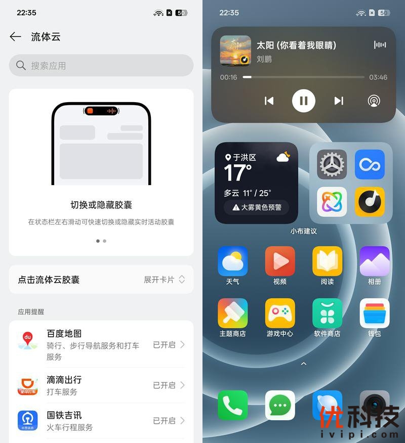 系统内的流体云功能非常好用,开启后很多的应用提醒将汇集于主屏的前置镜头附近,非常的醒目,并且还有着精细的动画效果,例如打车、导航外卖、以及听音乐等等。