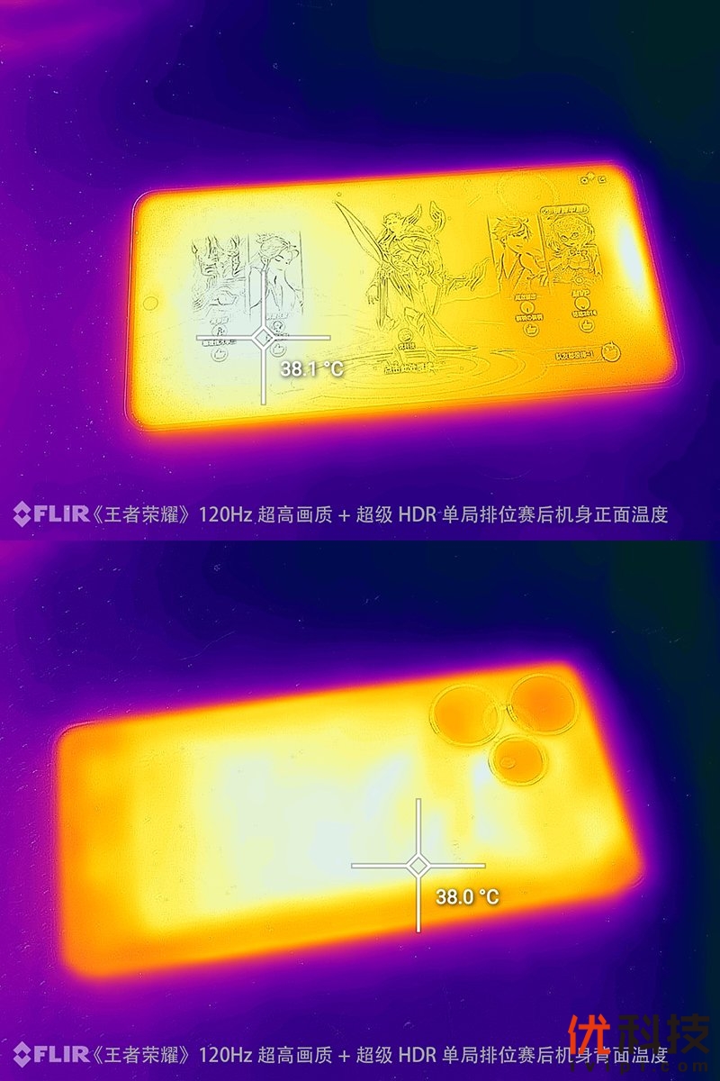 首先是王者荣耀,在开启120Hz最高画质,开启超级HDR画质功能后进行排位赛体验,在近16分钟的排位赛体验后,机身正面最高温度为38.1℃,机背最高温度为38℃。