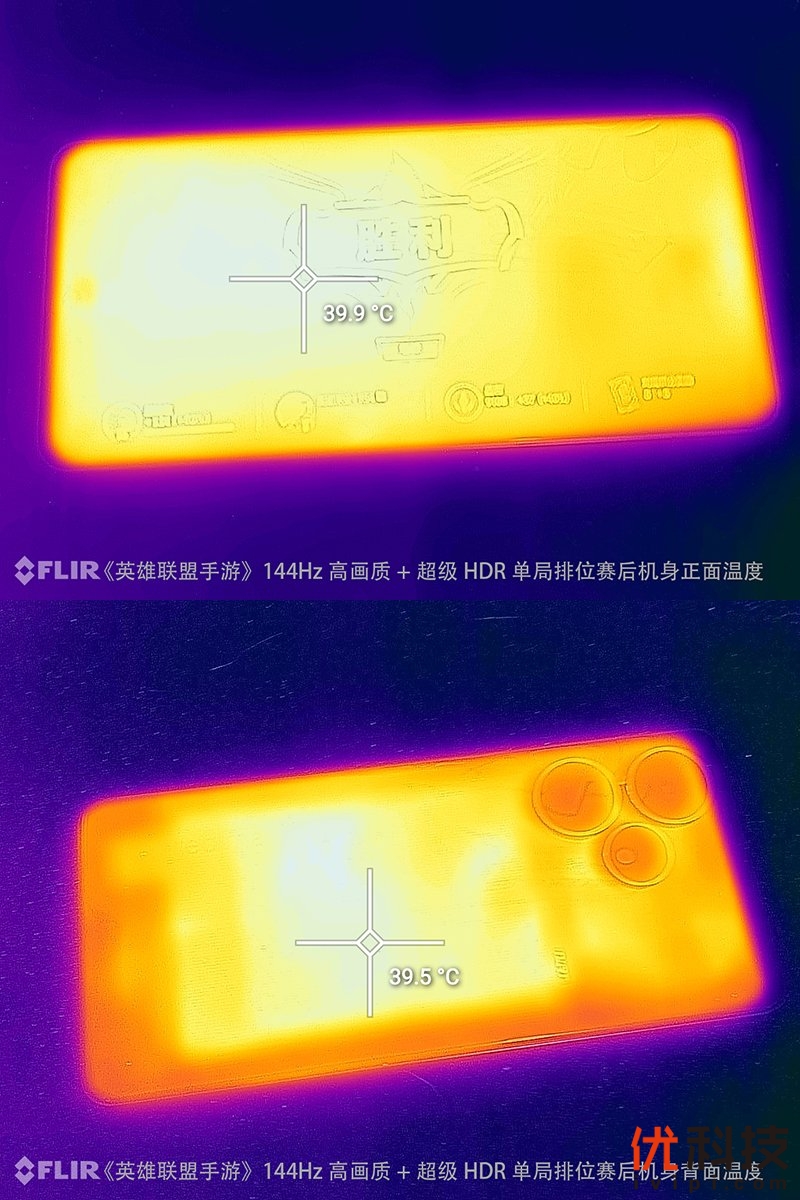 英雄联盟手游在开启144Hz高画质+超级HDR画质功能后进行单局排位赛,在近28分钟的排位赛后,机身正面最高温度为39.9℃,机背最高温度为39.5℃。