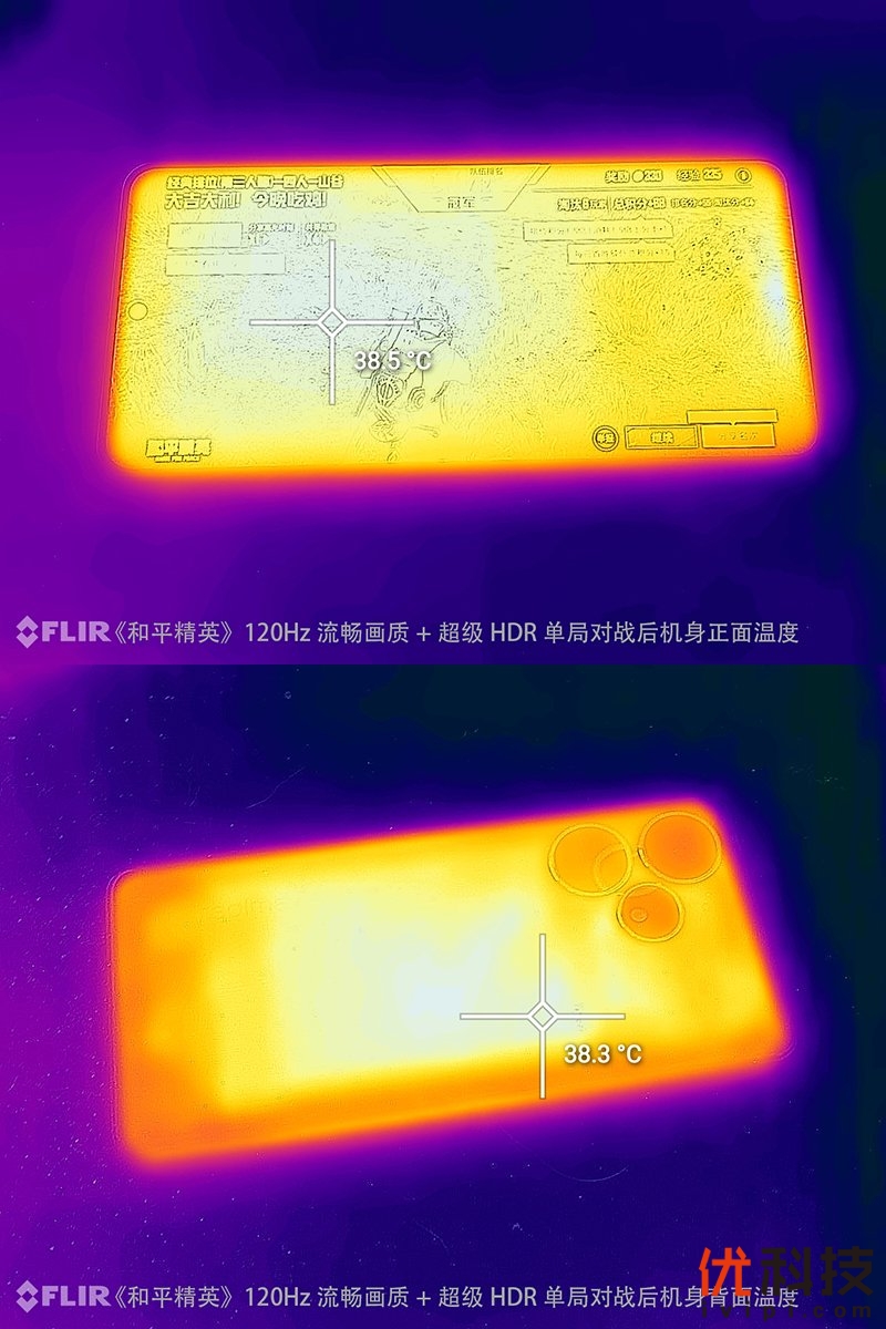 和平精英游戏则是选择120Hz流畅画质+超级HDR功能进行单局比赛,在近15分钟的比赛结束后,机身正面最高温度为38.5℃,机背最高温度为38.3℃。