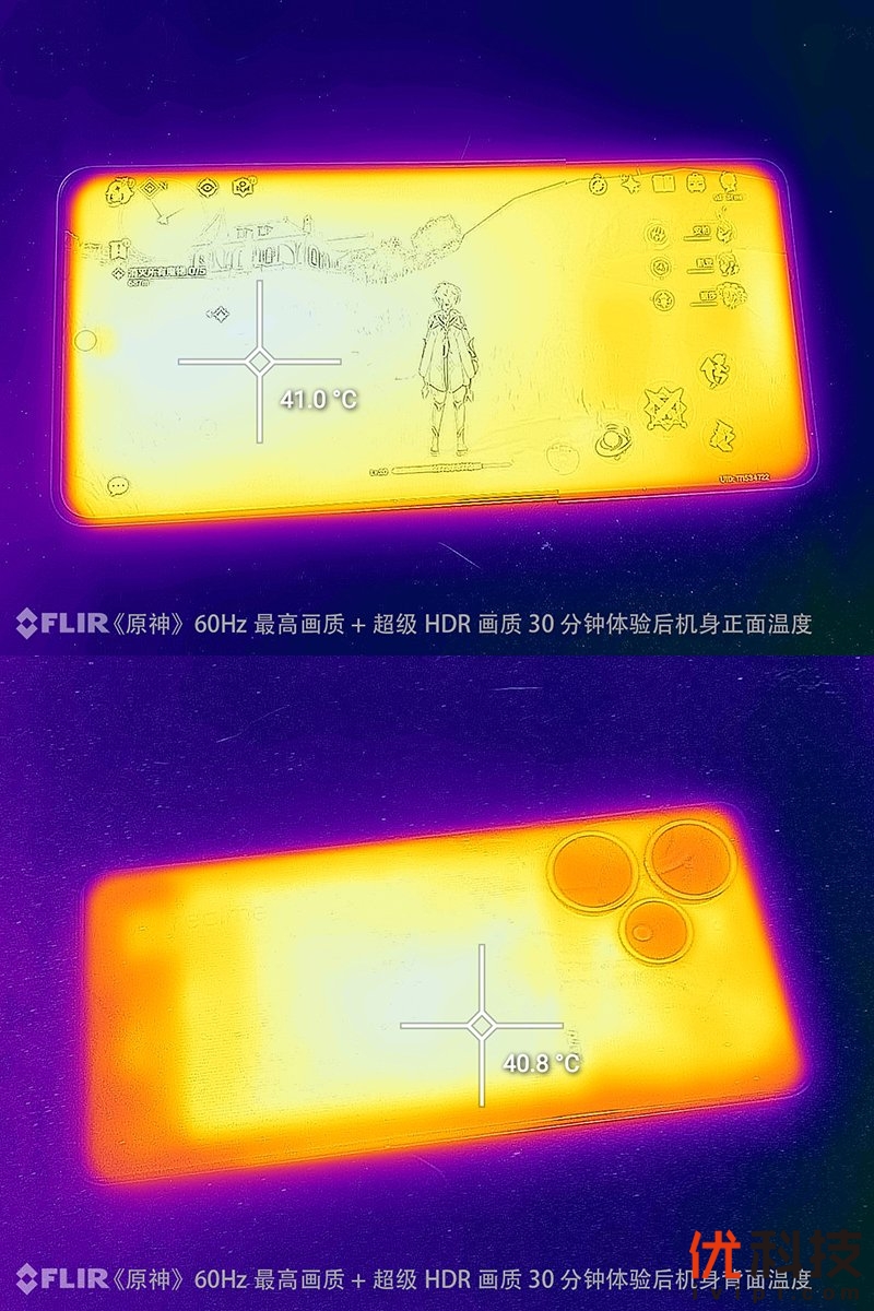 原神在选择60Hz各项最高画质+超级HDR功能进行30分钟的模拟日常游戏体验后,机身正面最高温度仅为41℃,机背最高温度仅为40.8℃。