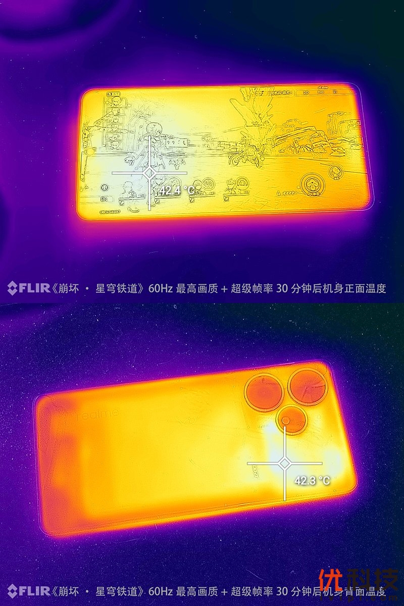 对配置要求较高的星铁则是选择60Hz最高画质+超级帧率功能进行30分钟的模拟日常非跑图对战体验后,机身正面最高温度为42.4℃,机身背面最高温度为42.3℃。